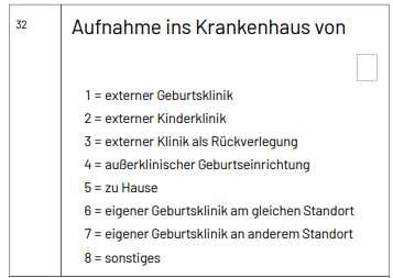Dieses Datenfeld „Aufnahme ins Krankenhaus von“ (Spezifikation 2026 V02, Datenfeldnummer 32) sieht wie folgt aus: